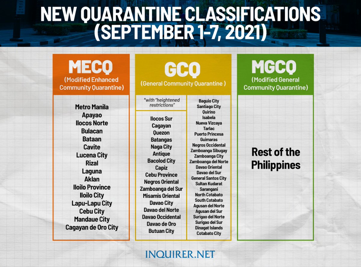 Inquirer On Twitter Malacanang Announces The Latest Community Quarantine Classifications Which Shall Take Effect Beginning September 1 Until September 7 2021 Https T Co Eypb23ajtp