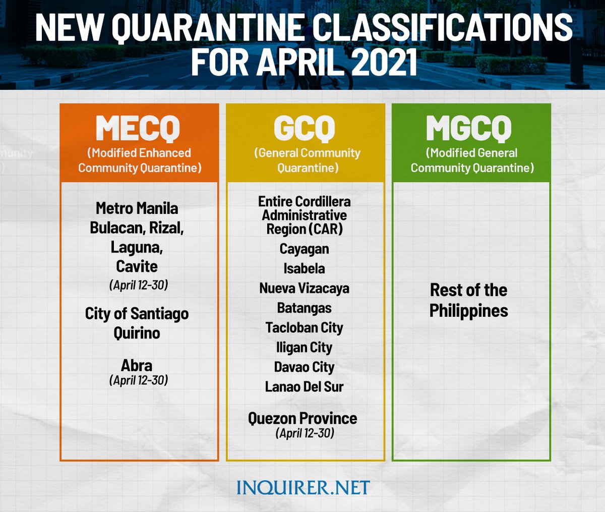 Inquirer On Twitter Here S The List Of The New Quarantine Classifications For April 2021 Read Https T Co O2kzbwldrs